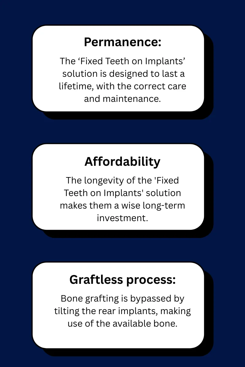 Your all-inclusive fees for the All On 4 solution is $24,000 per arch. This depends on your initial dental condition, medical history, degree of bone loss, and materials used for the final bridge.